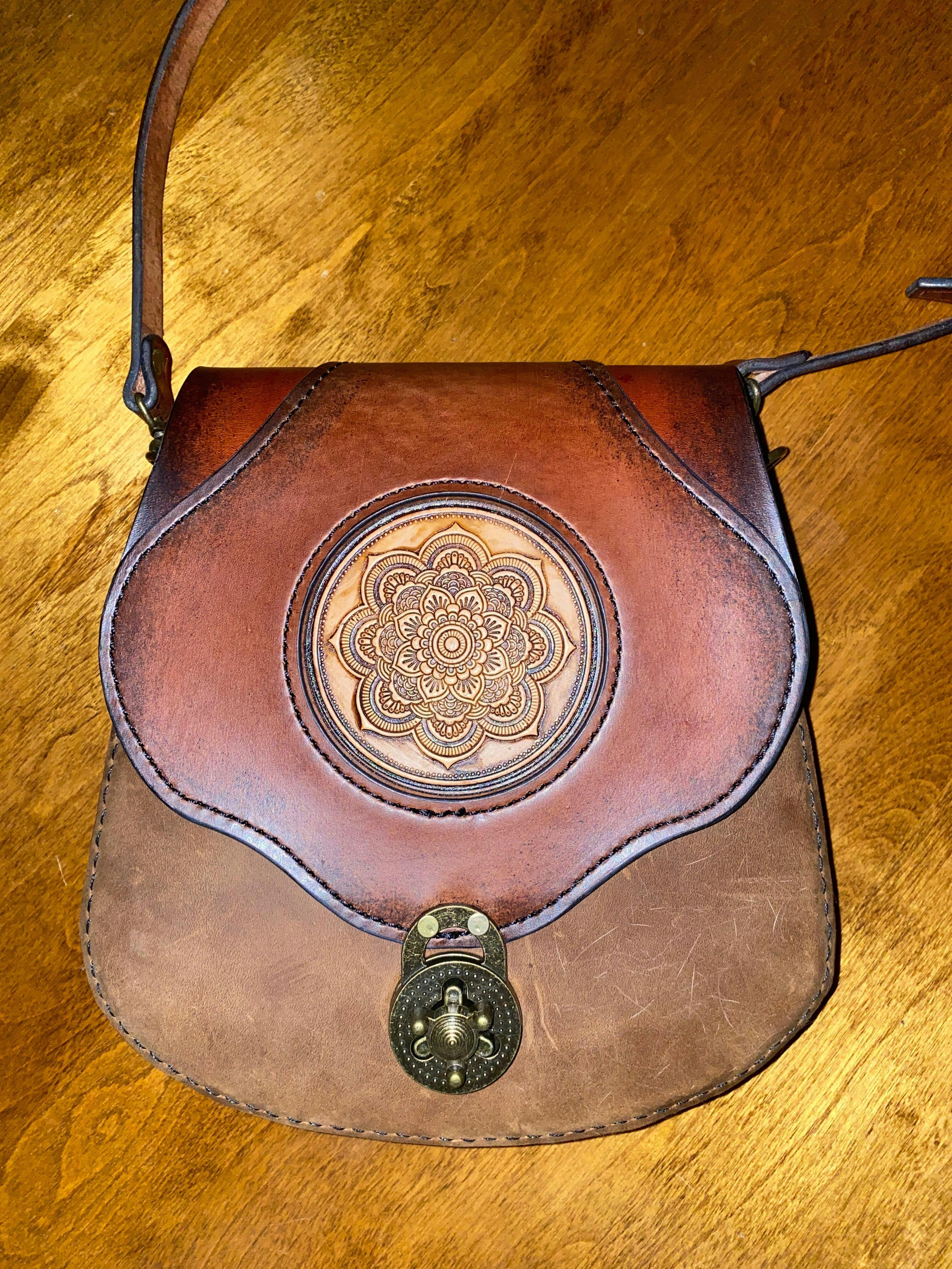 The Brigid is a smaller crossbody style bag perfectly sized to fit a cellphone and wallet for a day out or festival. It measure 7” x 7.5” and about 2” deep.